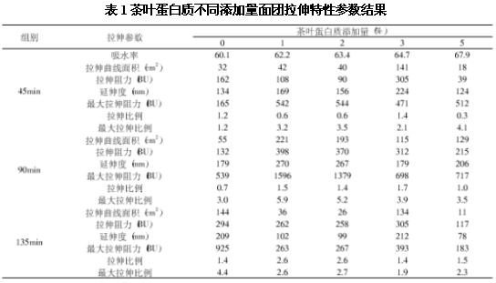 利用小麦粉面团拉伸仪进行研究,结合表1可知,对面团的拉伸特性参数,总体而言,茶叶蛋白质的添加,使拉伸曲线面积、拉伸阻力、延伸度、拉伸比例先增加后降低。茶叶蛋白质添加量从1%~5%,随着添加量的增加,面团粉力先升高后降低,3%是一个拐点,添加量超过3%,面团强度下降。