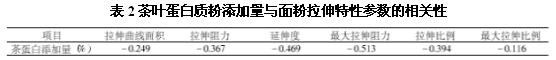 由表2可知,按照不同比例添加茶叶蛋白质后,通过小麦粉面团拉伸仪研究得出结果,面团的拉伸曲线面积、拉伸阻力、延伸度、最大拉伸阻力和拉伸比例都与茶叶蛋白质添加量呈现负相关。由表1、表2可以看出,3%的茶叶蛋白质添加量是面团拉伸特性转变的一个拐点,这种现象可能是因为茶叶蛋白质作为一种外源蛋白添加至面粉中时,随着添加量的增加,面粉本身的面筋蛋白被不同程度的稀释,这就使麦谷蛋白和麦角蛋白必须相互结合才能产生的面团的弹性下降,从一定程度上讲,茶叶蛋白质阻碍了面筋网络结构的形成,使得面筋蛋白自身具有的延展性有所下降。